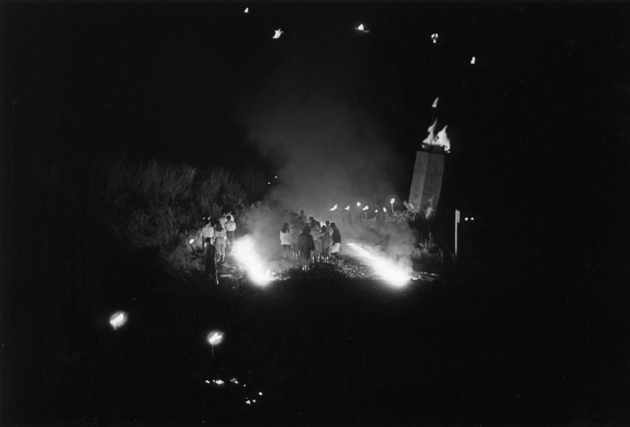 Mais uma vez no coletivo, todos rumavam até o terceiro ponto, uma lagoa arborizada em uma reserva florestal, nas imediações da cidade recém-saída. O ato que encerrava a jornada se dava em torno de uma fogueira. Merlin caíra sob o feitiço de uma jovem donzela que o aprisionara com sua própria magia. Destituído de seus poderes, ele flutuava impotente pela água, enclausurado dentro de uma enorme esfera inflável de cristal. Meia noite nos relógios e, envolto na névoa noturna, os peregrinos adentravam a lagoa pilotando seus pedalinhos para contemplar o cruel destino do grande mago. Após o brinde com uma taça de vinho, sempre oferecida aos que participavam das expedições da Kompanhia do Centro da Terra, a equipe regressava de ônibus, sem paradas, até o marco inicial, completando 130 quilômetros de percurso.